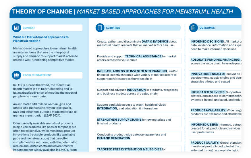 In addition to the theory of change, there are several existing resources on market-based approaches for menstrual health and why they matter. We will continue to add to this list of resources as more become available: